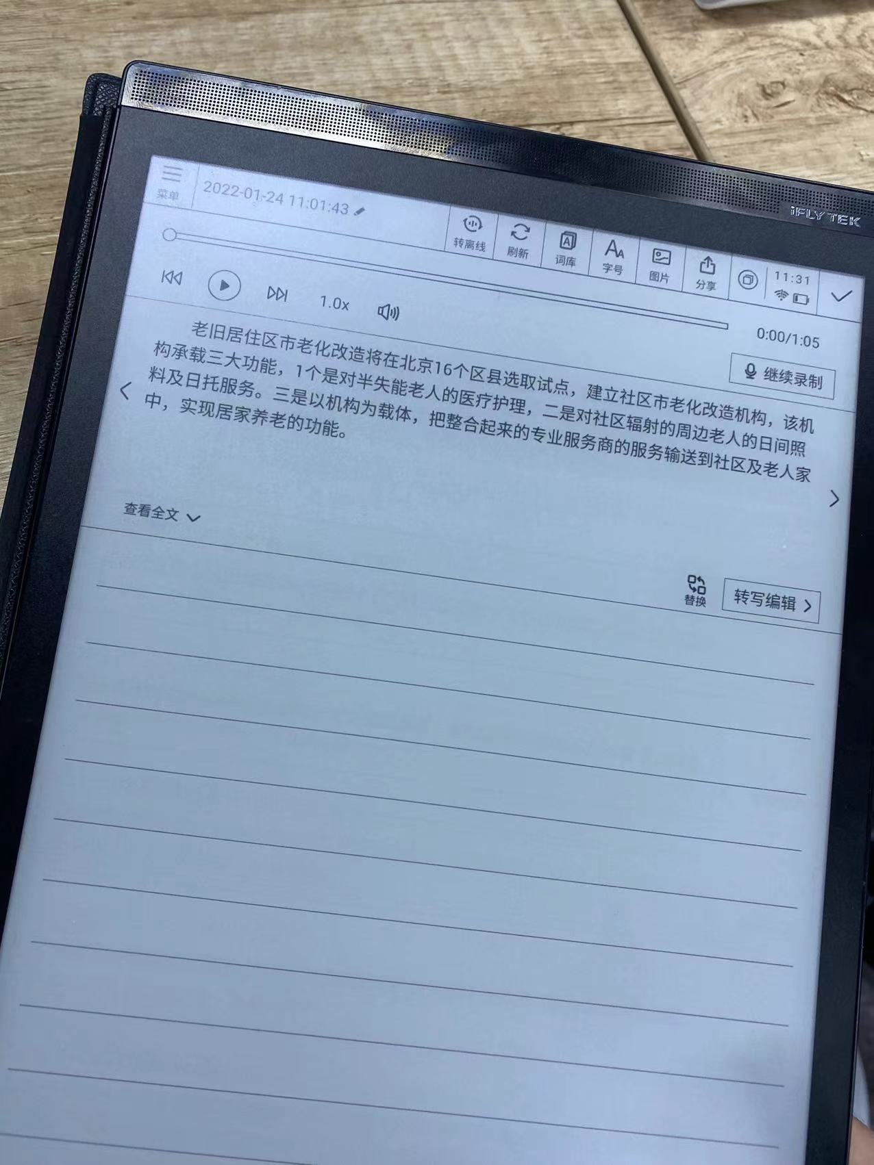 秉承着科大讯飞在人工智能语音领域的领先优势,科大讯飞智能办公本内置了语音转写功能,能够将会议、采访中的发言实时转写到屏幕上,方便用户对内容进行梳理。中英文及中文方言的识别,以及配置的7大行业词库,让讯飞智能办公本在面对复杂会议时也能够有优秀的表现。此外,在面对多个发言人的会议时,讯飞智能办公本也能凭借声纹对发言人进行有效识别,并做到区分记录。当然作为一款墨水屏阅读器,科大讯飞配置了10.3英寸的墨水屏以及T-1000芯片,使得翻页不卡顿、高刷新率且低延迟。