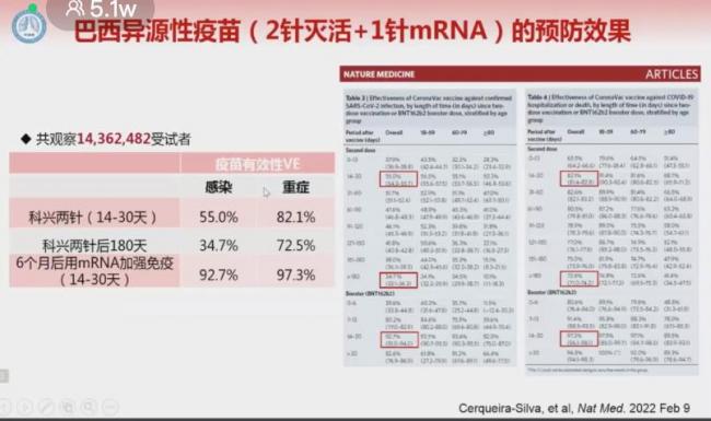 在课程中,钟南山院士分享了在巴西开展的异源性疫苗接种的真实世界数据,该研究对超1436万的受试者观察发现,科兴疫苗接种两针后14到30天,预防感染有效率达55%,180天后,预防感染有效率达34.7%。14-30天后防止重症有效率达82.1%,180天后重症有效率达72.5%。