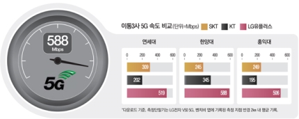 还有些人分析,因为LG U+用V50 ThinQ 5G已经做了充分的优化工作,所以速率才会很好,但是,我们用三星电子 Galaxy S10 5G测出来的结果也一样,LG U+的速率是最好的。在弘一大学用Benchbee测出来的Galaxy S10平均速率为SKT 361Mbps、LGU+ 377Mbps, LG U+的速率比SKT的高,在现场自行测试的结果当中,LG U+达到了598Mbps,在三大运营商当中最快。三星电子使用自己开发的Exynos芯片,LGU+搭载高通的骁龙855。LG U+称,“与竞争公司相比,我们提早准备了终端和网络的对接工作,优化工作进展较快,因此快速提高了网络品质”。