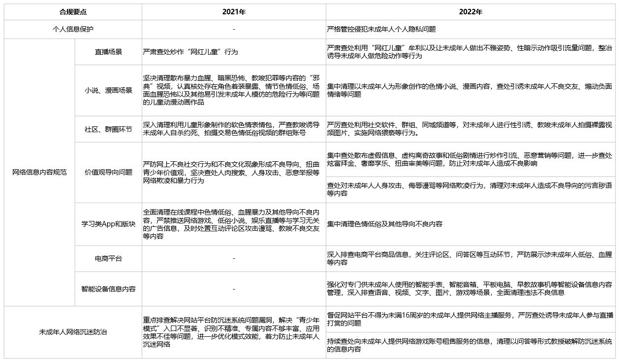 “清朗·2022 年暑期未成年人网络环境整治”专项行动包含 10 个方面的整治重点,主要合规要点可以概括为:未成年人个人信息保护、网络信息内容规范和未成年人网络沉迷防治这三个方面。2021 年与 2022 年的暑期未成年人网络环境整治行动要求整理如下: