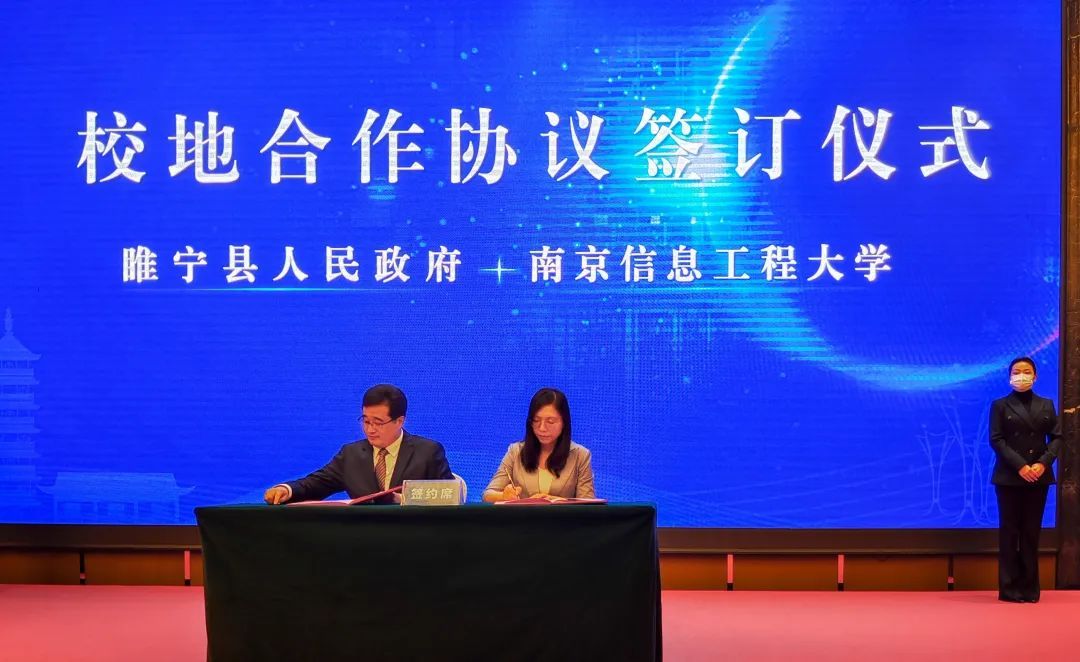 睢宁县人民政府副县长陈永(左)与南京信息工程大学副校长马嫣教授(右)签订校地合作协议