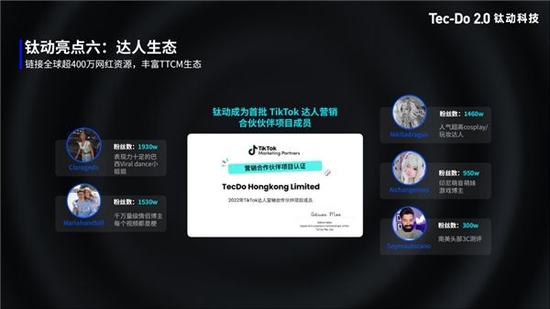 IMCreator工作室拥有庞大的网红资源库,并且钛动科技也自研网红SaaS平台钛客KOL,钛动科技已链接全球超400万网红资源,可为客户提供深度与广度兼备一站式海外达人营销。