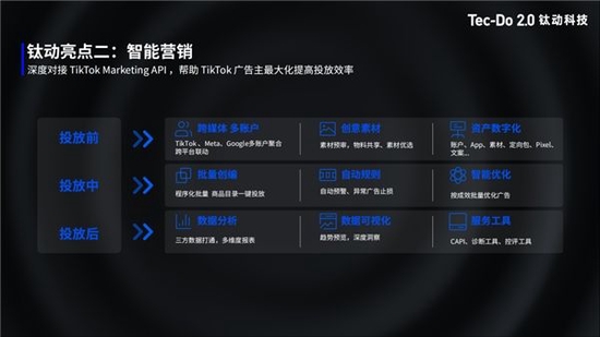 钛动科技基于TikTok Marketing API搭建了最大化效率的一站式投放工具,让TikTok广告主出海更简单。