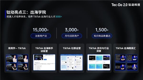 钛动科技围绕TikTok营销生态打造了完善的课程体系与人才培养体系,如有TikTok周周学,TikTok出海新手训练营,TikTok社群运营、资讯与行业洞察等,目前已帮助培养TikTok出海行业人才3000+。
