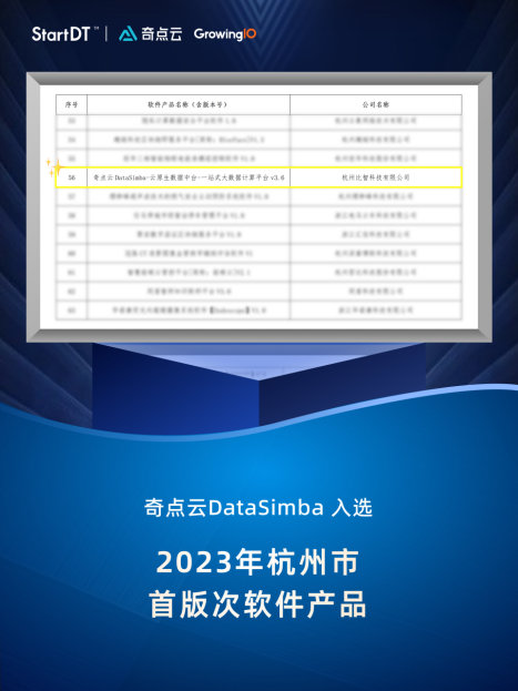 杭州市经济和信息化局正式公布“2023年度杭州市首版次软件产品名单”,通过层层评审,奇点云数据云平台DataSimba成功入选。